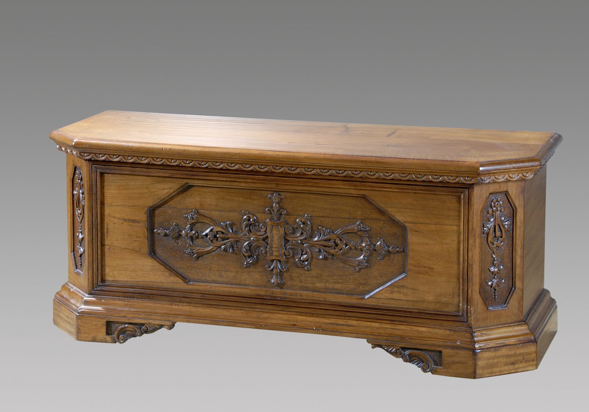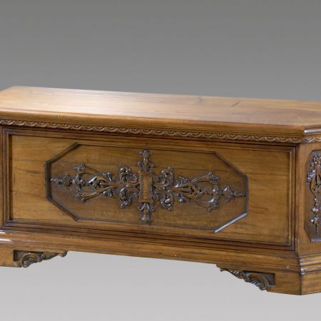 Cassapanca in noce con intaglio realizzato a mano con lucidatura a fonitura anticata